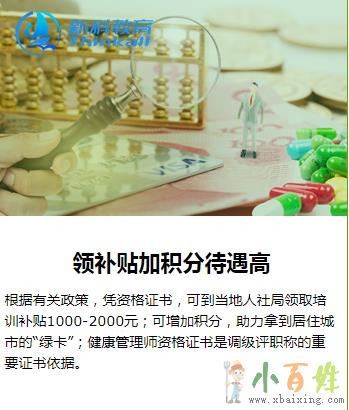 有志于在健康体检、.服务、健康保险、*保健、健康养老以及体育健身、.旅游、美容养生、母婴服务、保健食品、营养等行业从事健康教育、健康咨询、健康管理及相关的各界人士小.百.姓.网。招生专业共分健康管理师、高级健康管理师两个级别。健康管理师要求大专以上学历,或从事健康及相关工作3年以上;高级健康管理师要求具有健康相关专业本科学历,或大专学历及从事健康相关工作5年以上,并取得健康管理师证书者。医学、营养、心理等健康领域特殊贡献者,在级别申报时可适当放宽,不同级别的学员需参加相应级别的考试欢迎www.xbaixing.com。