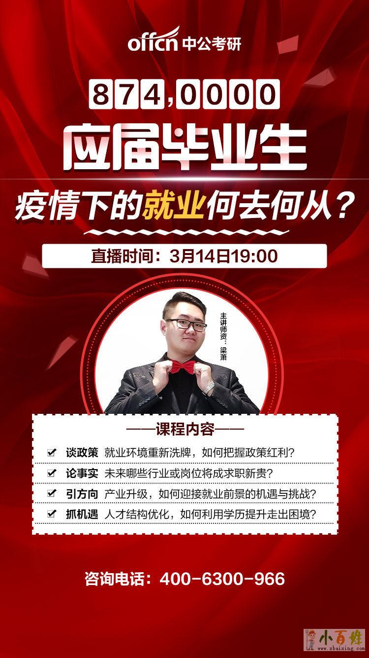 应届生必看!新冠肺炎疫情过后,874万大学毕业生如何在就业寒冬中寻找发展之路?寻找自救妙招,打造核心竞争力?3月14日晚7点,中公考研导师梁萧教你冲破就业困境之法! http://19.offcn.com/class-114132/?area=wuxiwww.xbaixing.com